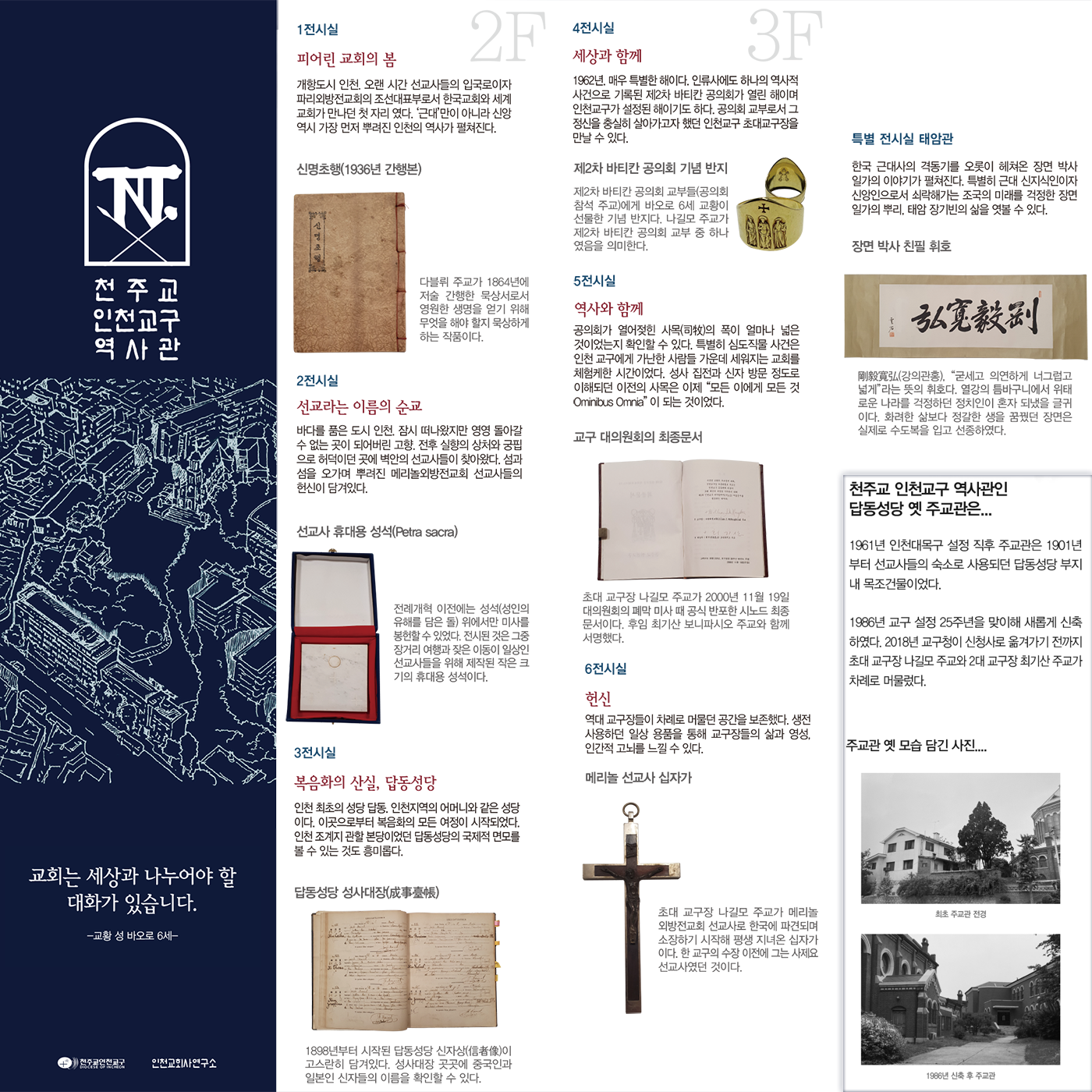 인천교구 역사관은 항구도시의 특성을 반영하여 “개항도시 ‧ 산업도시 인천, 세상 속에 세워지는 교회”라는 테마로 6개 전시실로 구성되었다.