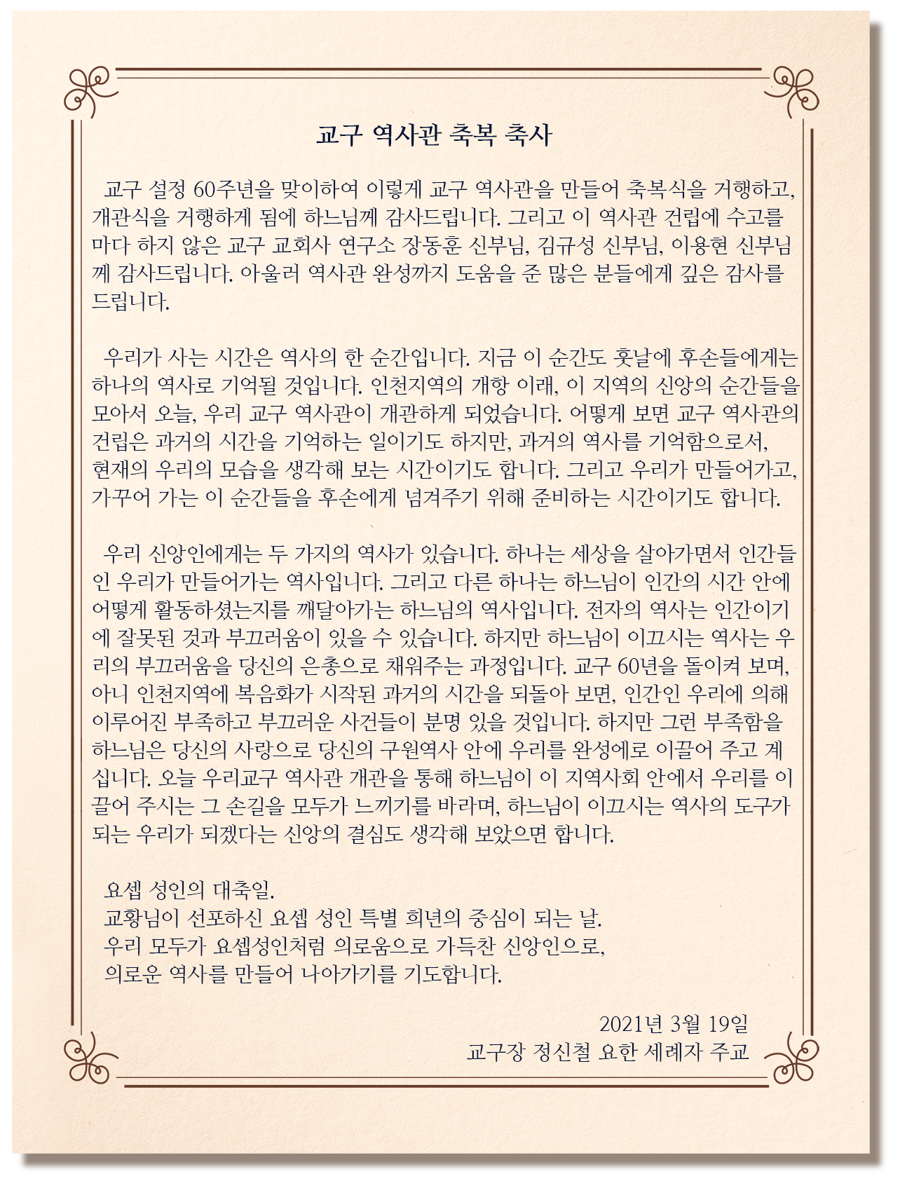 천주교 인천교구(교구장 정신철 주교)에서 교구 60주년 기념 역사관을 세웠다. 인천교구는 2021년 3월 19일(금) 오전 11시, 역사관의 제막과 축복식 등을 내용으로 하는 기념식을 갖고 역사관을 열었다.