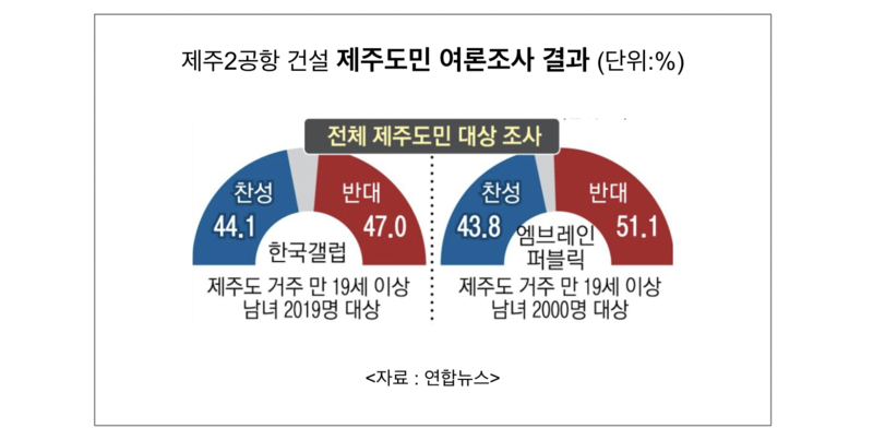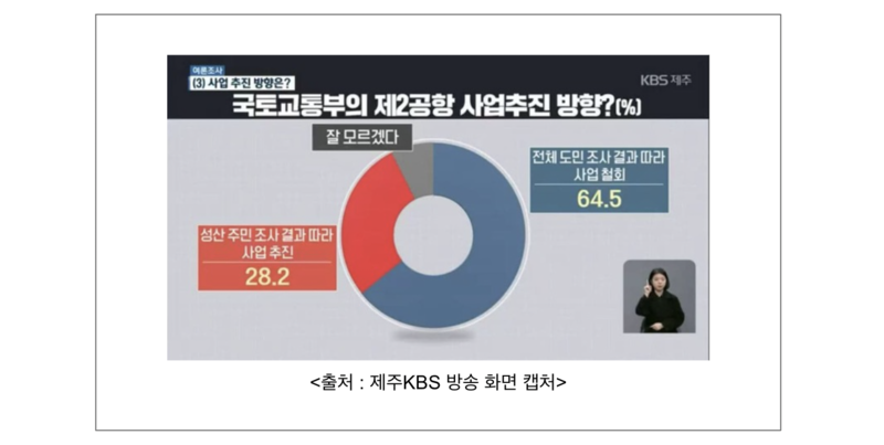 2021년 2월, 사회적 합의와 약속에 따라 국토부와 제주도, 도의회가 합의해 제2공항에 대한 도민 의견수렴 방안으로 '여론 조사'를 채택했고, 9개 지역 언론사가 공동주관해 여론조사를 실시했습니다. 도민공론화에 준하는 여론조사 결과는 '제주제2공항 반대'가 높게 나타났으며, '국토교통부가 어느 쪽 의견을 따라야 하는지'에 대한 KBS 여론조사 결과도 '전체 도민의 뜻에 따라 사업 철회'가 64.5%로 높게 조사되었습니다.