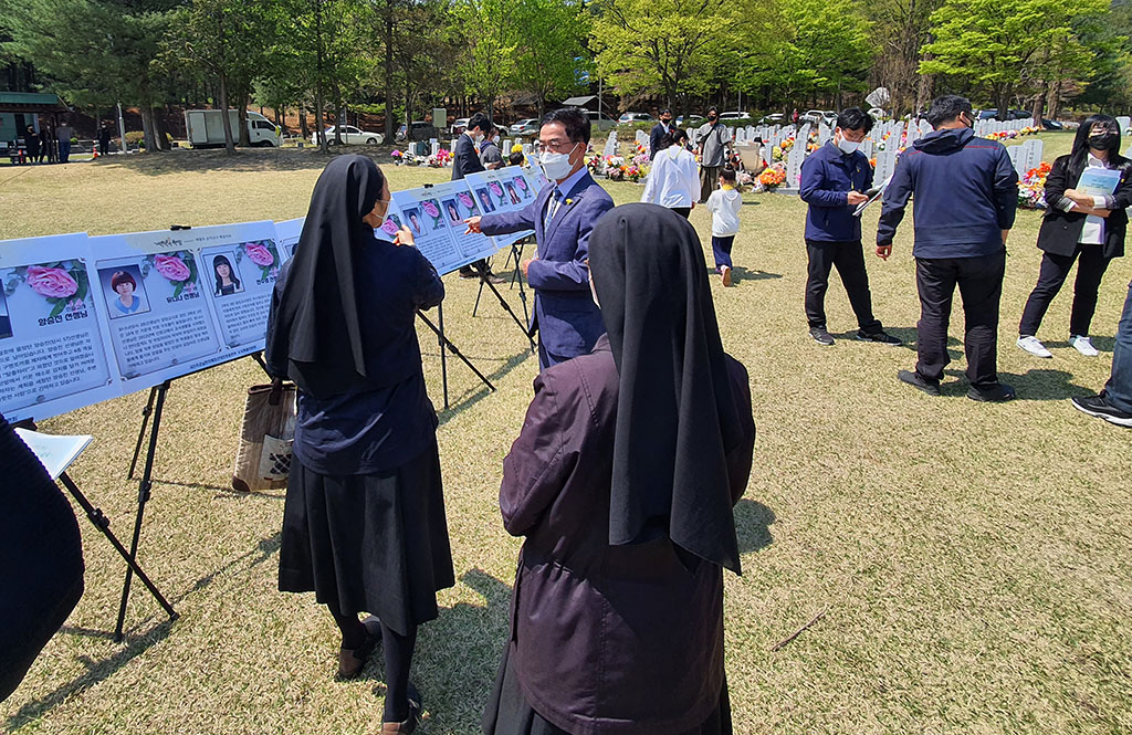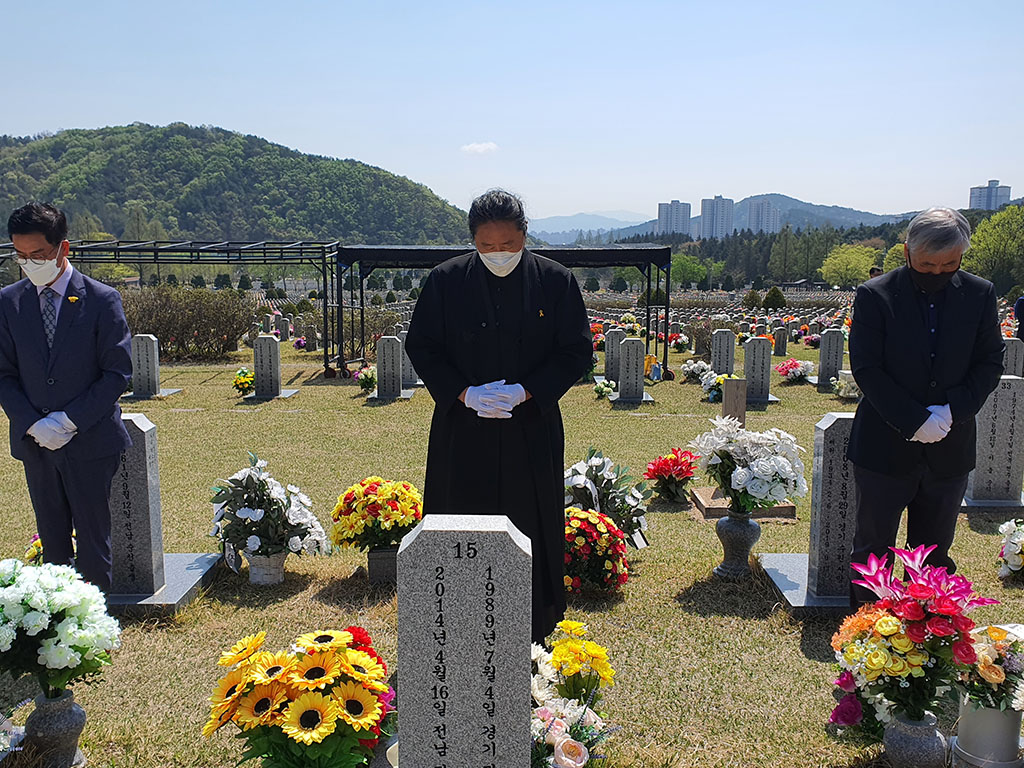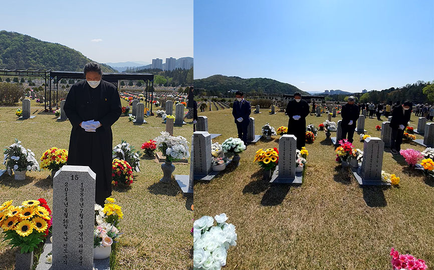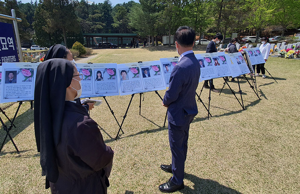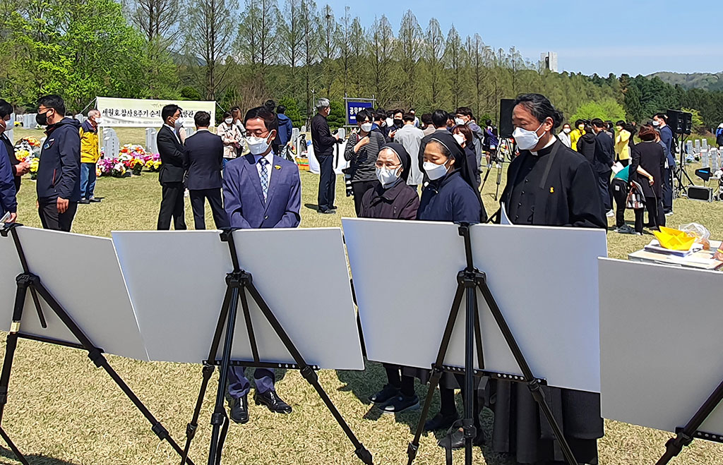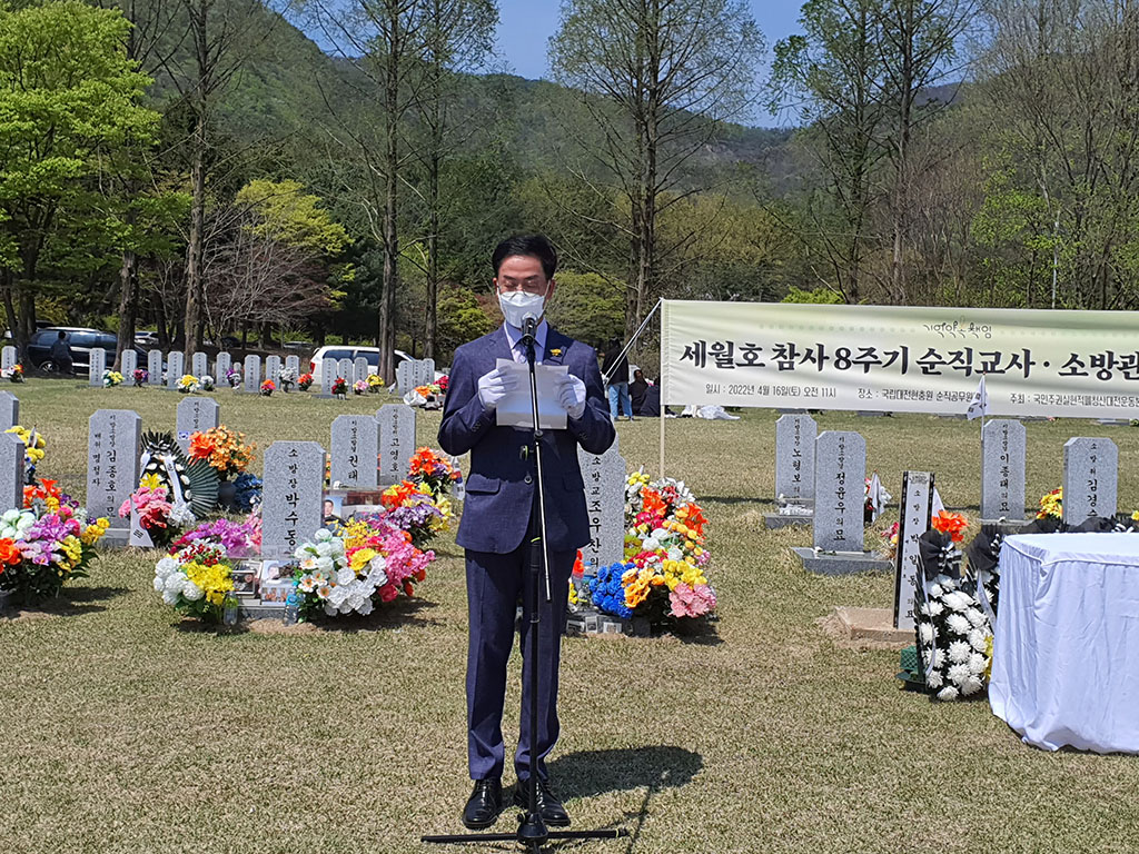 천주교대전교구정의평화위원회는 2022년 4월 16일(토) 오전 11시, 세월호 참사(2014.4.16.) 8주기를 맞이하여 대전현충원에서 개최된 <세월호 순직교사.소방관 기억식>에 참석했다. 천주교사회복음화국장 겸 대전정평위원장인 김용태 마태오 신부와 위원들은 대전시의 후원과 대전시민단체의 주최로 대전현충원 순직공무원 묘역에서 개최된 <기억식>에 참가하여, 순직교사 및 소방관을 기억하며 헌화하고 합동 참배했다.