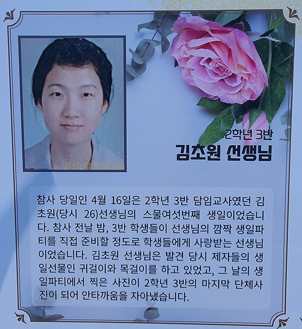 또한 단원고 2학년 3반 김초원 선생님의 유가족인 아버지 김성욱 님은 유족발언으로 마이크 앞에 서서, “아빠와 팔짱끼고 데이트하던 딸이 학생들에 대한 열정만 기억하고 싶은데, 8년 전 4월 16일 스물여섯번째 생일에 아이들이 선물한 귀걸이가 왜 이렇게 생각나는지 모르겠다”라고 하면서, “사랑하는 아이들과 그곳에서 영원히 함께 있으니 행복한 담임선생님이라고 위로하고 싶지만, 너와 너의 아이들은 이 세상에 없구나”라면서 “304명, 250명의 학생, 12명의 선생님 그리고 그의 가족들, 슬프고 슬프다. 어제도 슬프고 오늘도 슬프다. 8년이 아니라 10년이 가고 100년이 가도 슬플 것이다.”라며 “미처 피어보지 못한 딸이 스물여섯 생일의 꽃다운 나이에 아이들과 함께 수학여행 순직한 딸을 많이 오랫동안 기억해주면 고맙겠다고 자신의 소회를 밝혔다.
