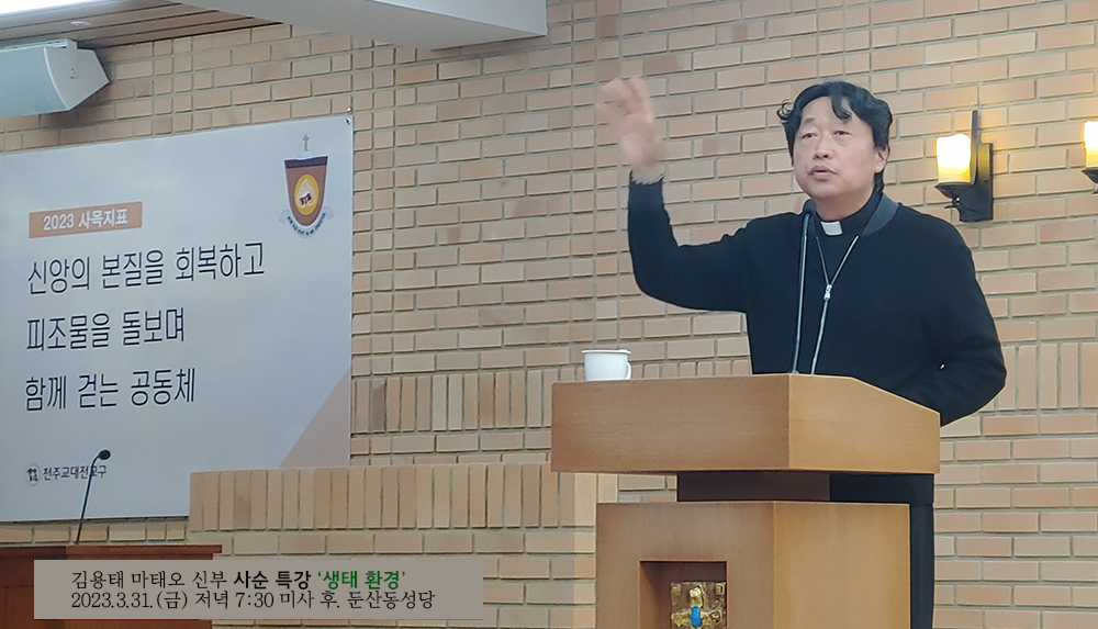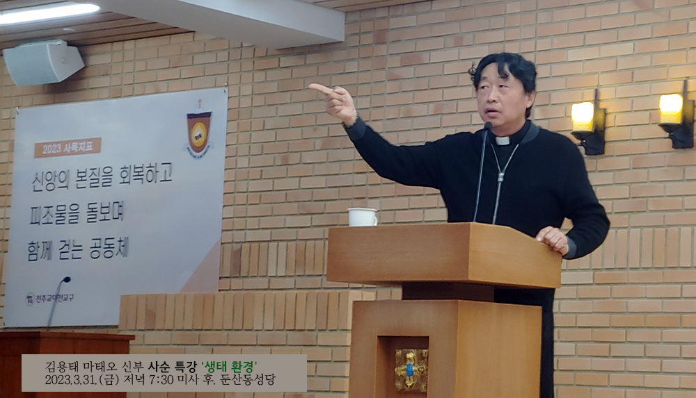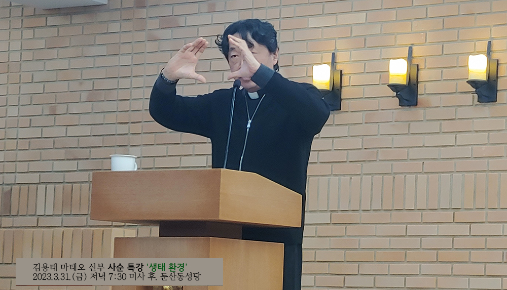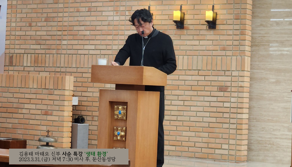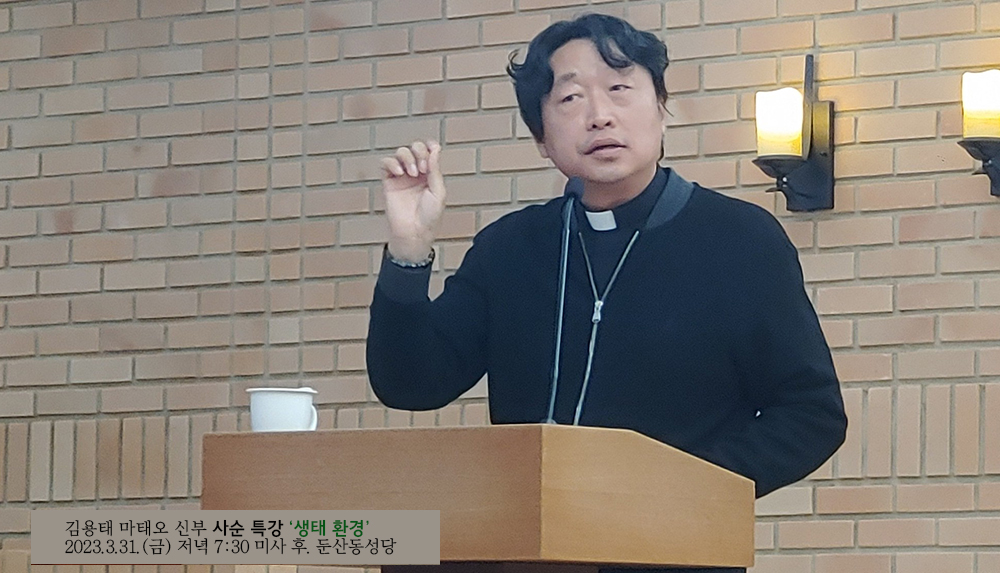 천주교 대전교구 사회복음화국장 겸 정의평화위원장을 맡고 있는 김용태 마태오 신부가 둔산동 성당(주임신부 송준명 프란치스코)의 초청으로 2023년 3월 31일(금) 둔산동 성당에서 '생태 환경'을 제목으로 하는 사순특강을 실시했다. 저녁 7시 30분 미사를 마치고 8시 5분부터 9시 25분까지 약 80분간 진행된 강연은 성당의 대부분의 좌석을 모두 채운 상태의 열띤 분위기 속에서 시작되었고, 유머와 재치있는 입담에 교중에서 웃음이 터져나오면서도 생태의 진정한 의미를 함께 성찰하는 시간이 되었다. 다음은 강연내용이다.