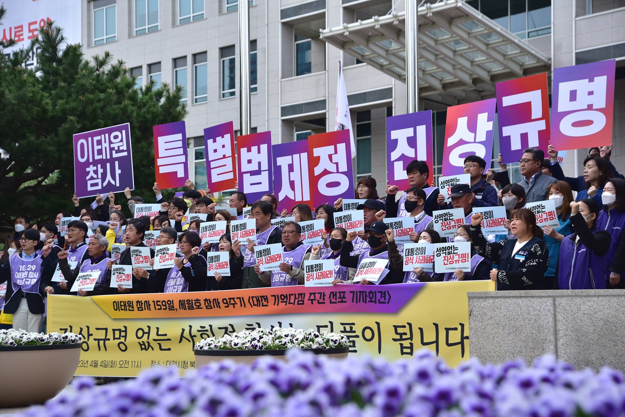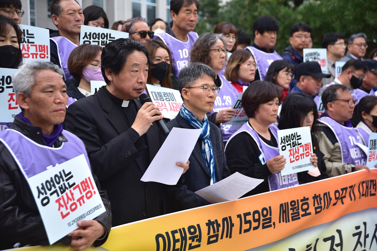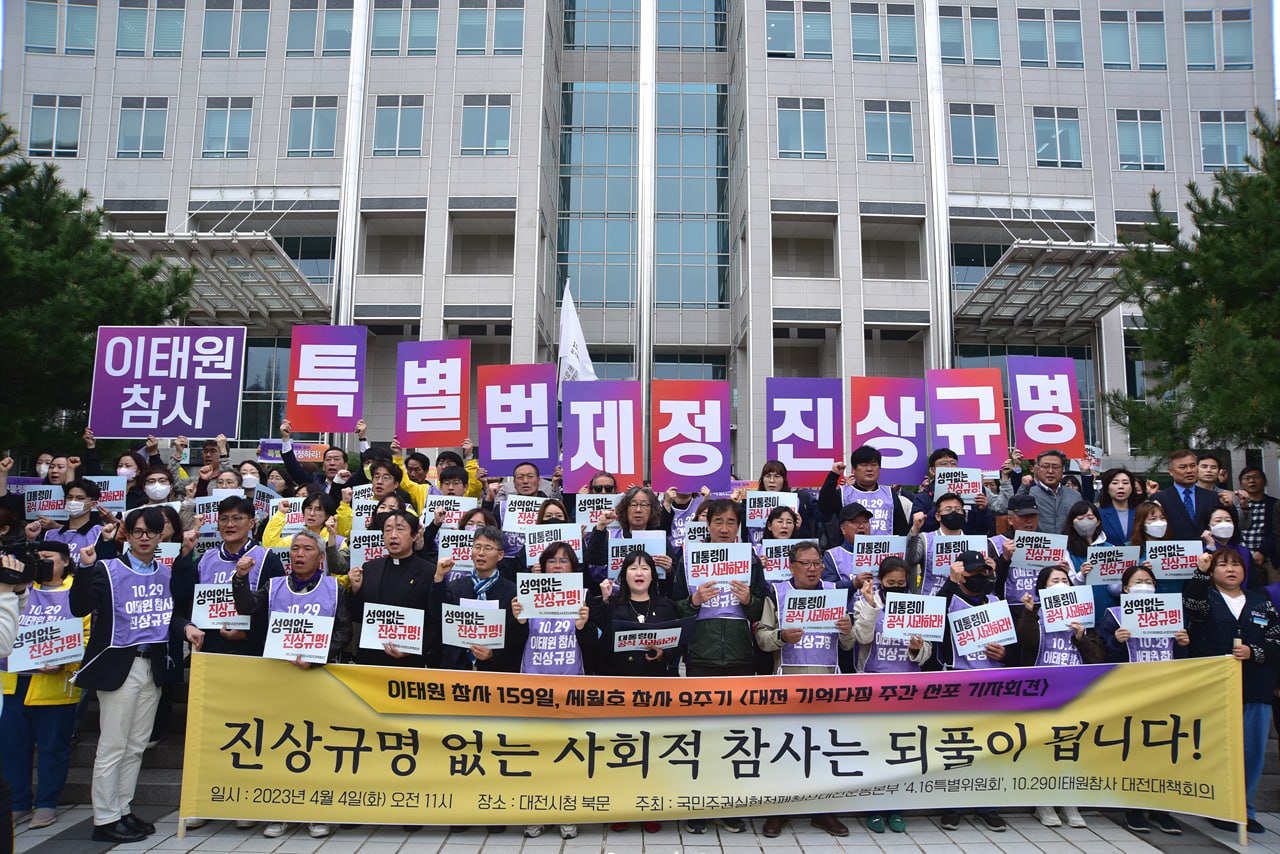 천주교 대전교구 정의평화위원회(위원장 : 김용태 마태오 신부)는 2023년 4월 4일(월) 11:00, 대전시청 북문 앞에서 이태원 참사 159일, 세월호 참사 9주기 대전 기억다짐주간 선포 기자회견(주최 : 10.29 이태원 참사 대전대책회의, 국민주권실현적폐청산대전운동본부 '4.16 특별위원회')에 참석하여 모두 발언(김용태 마태오 신부)을 하였다.