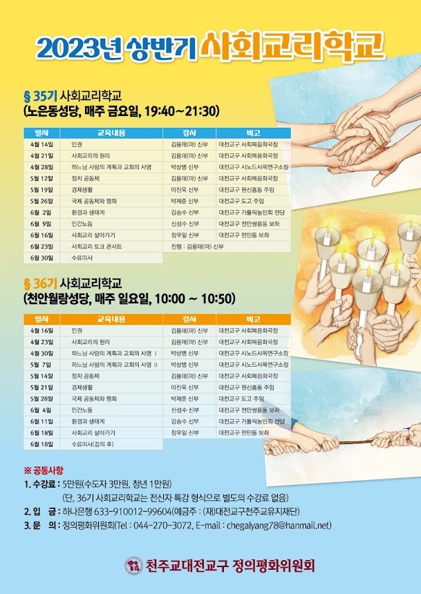 한편 제36기 사회교리학교는 천안 월랑성당에서 4월 16일(일)부터 10주간 매주 일요일에 열린다. 천안 월랑성당 사회교리학교는 기존의 사회교리학교의 방식을 탈피하여 교중미사가 열리기 전 전 신자를 대상으로 약 50분의 특강 형식으로 진행되며 수강료는 무료이다.