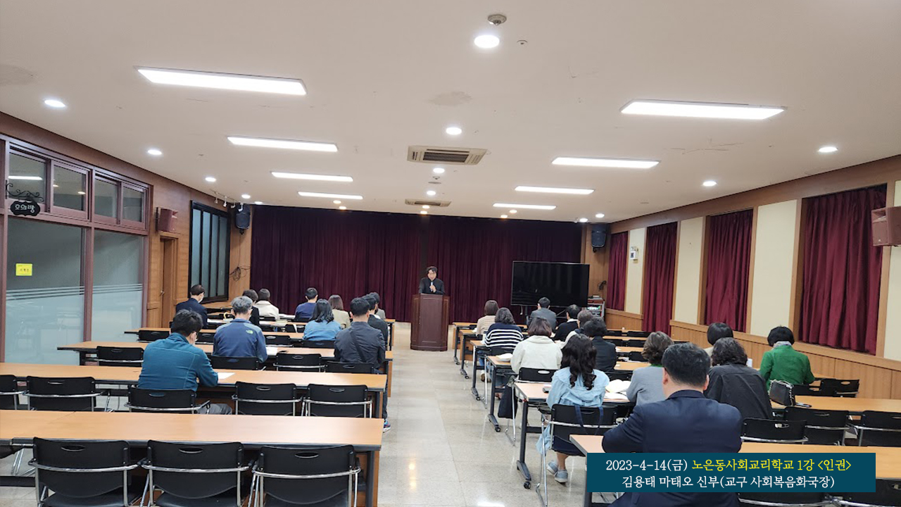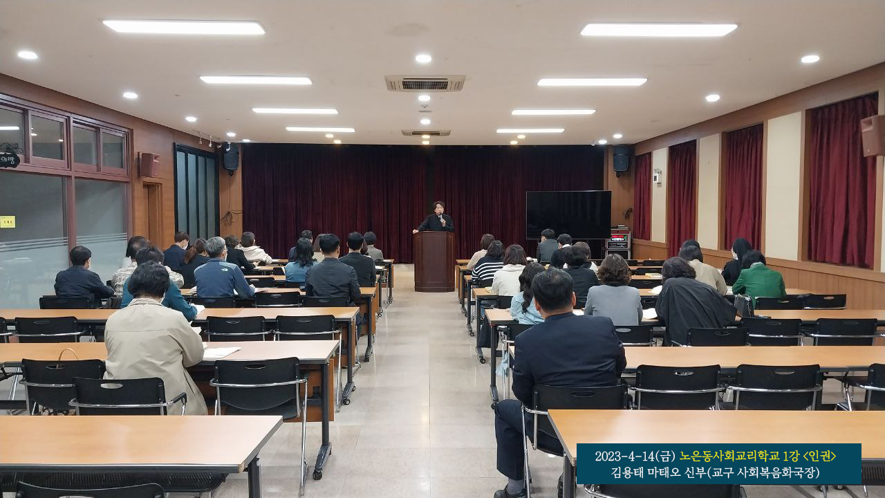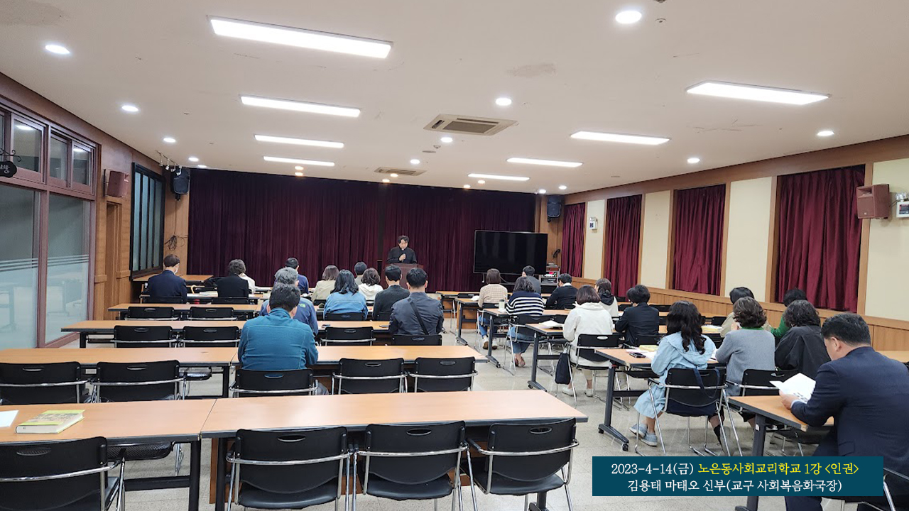 천주교 대전교구 정의평화위원회(대전정평위)는 2023년 4월 14일(금) 오후 7시 40분 노은동 성당에서 제35기 사회교리학교를 시작했다. 총 10주간 진행되는 이번 사회교리학교의 첫 강의는 행사를 주관하는 대전정평위 위원장 김용태 신부(대전교구 사회복음화국장)가 맡았고, <인권>을 주제로 약 110분간 강의했다. 수강을 신청한 31명의 신자들은 2시간 남짓한 짧지 않은 시간에도 강사와 수강생들이 서로 호응하며 열띤 분위기 속에서 진행되었다. 다음은 강의 전문이다.