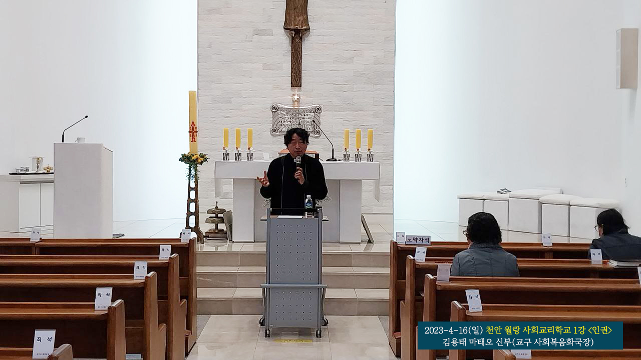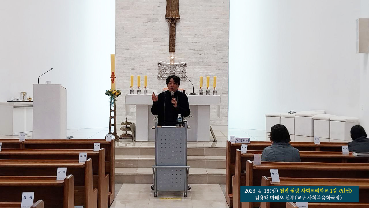 2023년 4월 16일(일) 오전 10시부터 약 50분간 진행된 첫번째 시간은 김용태 마태오 신부(교구 사회복음화국장 겸 정평위원장)이 강의를 맡았고, 주제는 '인권'이다. 김용태 신부는 먼저 인권의 바탕은 <인간의 존엄성>이며, 이것이 사회교리의 중심이기 때문에 이에 대한 통찰이 중요하다고 강조했다. 즉 인간이란 무엇인가를 생각할 때, 예수님께서 내 이웃을 내 몸처럼 사랑하라는 말씀 그 안에 인간의 존엄성이 살아있으며, 그것이 사회교리의 근간이라고 말했다. 이하는 강의의 주요 내용이다.