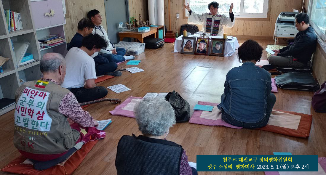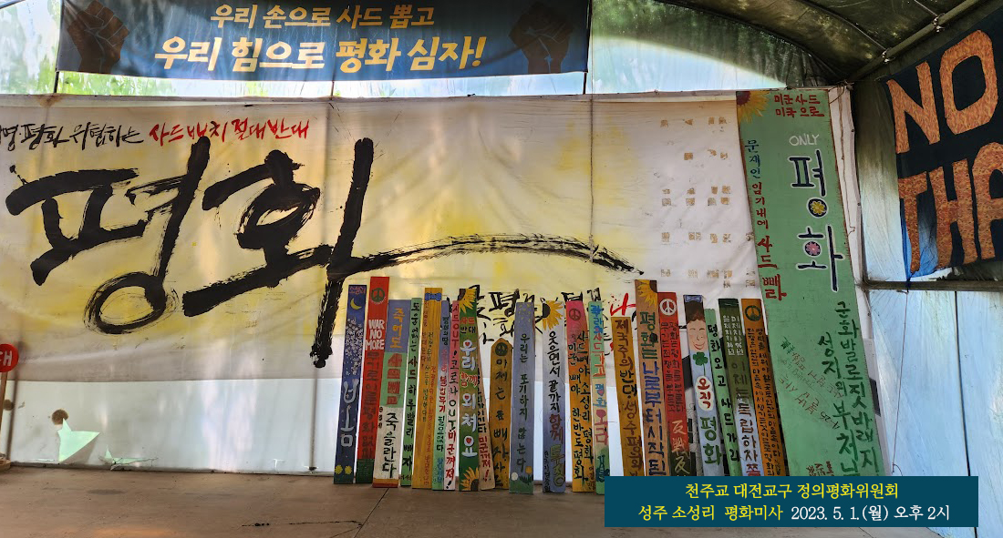 천주교대전교구 정의평화위원회(대전정평위)는 2023년 5월 1일(월), 노동절 휴무일을 맞이하여 경북 성주 소성리를 방문하여 사드배치의 반대와 한반도의 평화를 기원하는 미사를 봉헌했다. 오전 10시 30분 대전 유성구 원신흥동 성당을 출발하였고, 성주 소성리 마을의 천주교종합상황실에서 오후 2시 미사를 봉헌했다. 미사 주례를 한 김용태(마태오)신부는 강론(요한 복음 10,11-18)을 통해 사목(司牧), 목자(牧者)의 한자 풀이를 통해 사목자가 가져야할 바람직한 자세와 각자 자리에서 우리 모두 삯꾼이 아닌 목자라는 생각을 가지고 우리 안에 있지 않은 양떼가 들어오도록 행동해야 함을 강조하였다. 이날 성주 소성리 방문에는 대전정평위 일행 외에도  성주 지킴이 역할을 하는 형제(정진석 프란치스코)님과 구미에서 오신 자매(이 루치아)님, 그리고 마을의 어르신도 미사에 동참하여 의미를 더했다.