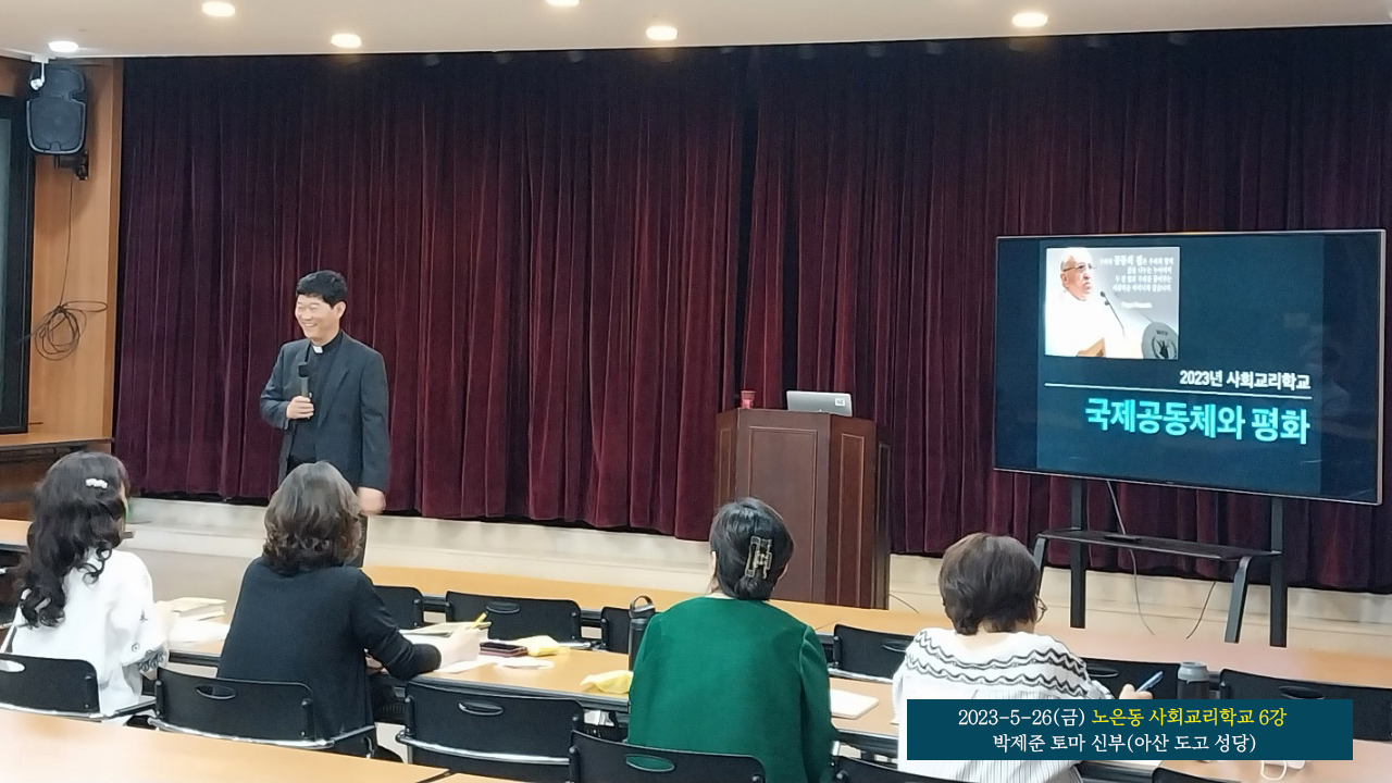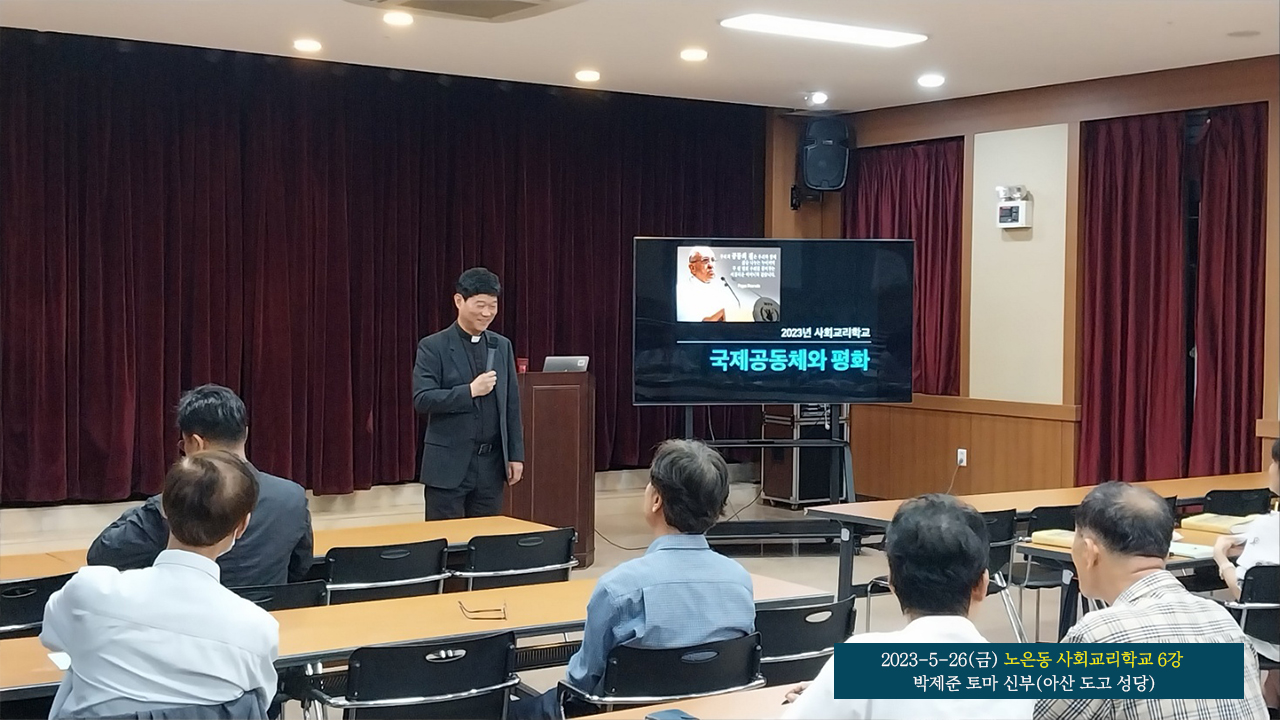 노은동 성당 사회교리학교 여섯 번째 강의가 2023년 5월 26일(금) 저녁 7시 40분 성당 지하 다목적실에서 개최되었다. 이번 강의 제목은 <국제공동체와 평화>이며, 아산 도고성당 주임신부로 사목 중인 박제준 토마 신부가 맡아서, 2시간 동안 진행했다.