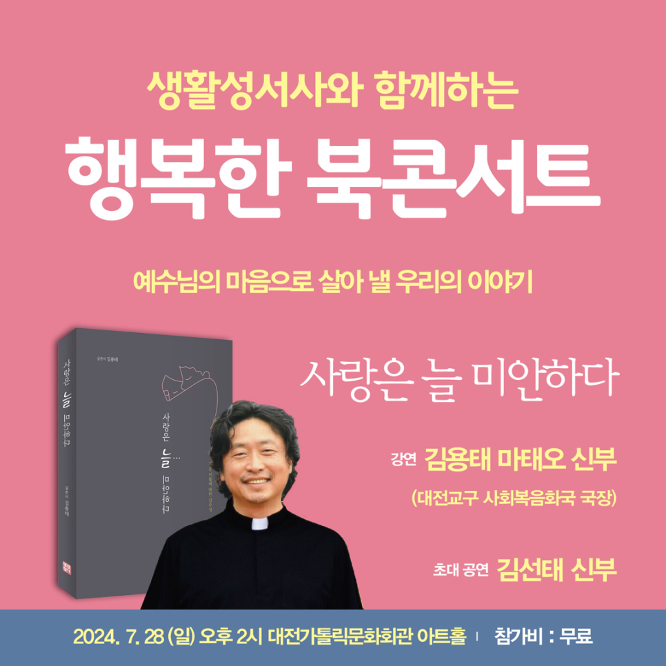천주교 대전교구 사회복음화국장(겸 정의평화위원회 위원장) 김용태 마태오 신부가 최근 첫 에세이집 《사랑은 늘 미안하다》를 출간하고, 북콘서트를 개최했다. 2024년 7월 28일(일) 대전가톨릭문화회관에서 열린 북콘서트에는 약 100여 명의 교우들이 참석하여 함께 콘서트를 즐겼다.