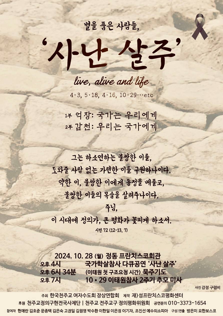 제주에서 초연을 시작한 다큐멘터리 연극 <사난 살주>가 오는 10월 28일(월) 서울 정동프란치스코 회관에서 선보인다. 한편 천주교대전교구정의평화위원회(위원장 김용태 마태오 신부)는 교구 사회복음화분과 교육 행사의 일환으로 이 연극을 초청했다. 이에 2024년 11월 9일(토) 오후 2시 30분, 새얼센터에서 이 연극을 공연할 계획에 있다.