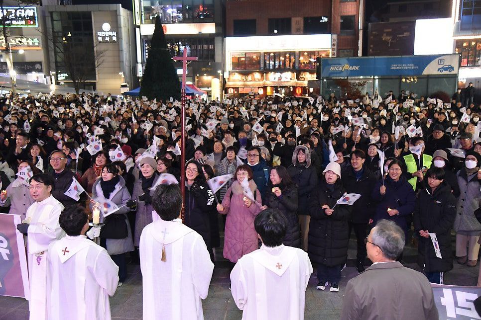 천주교 대전교구 정의평화위원회(위원장 김용태 신부)는 12월 9일(월) 주교좌 대흥동성당에서 '정의롭고 평화로운 세상을 위한 시국기도회'를 거행했다. 1부(시국미사), 2부(정의평화대행진)로 진행된 이날 기도회는 사제단 120명(대전교구 및 타교구,수도회), 수도자 및 신자 등 1,500여 명이 참여했다. 미사 후 주교좌 대흥동성당을 출발해 목척교를 거쳐 다시 우리들공원까지 행진을 한 후 연대단체발언과 구호 등을 제창한 후 행사를 마쳤다.