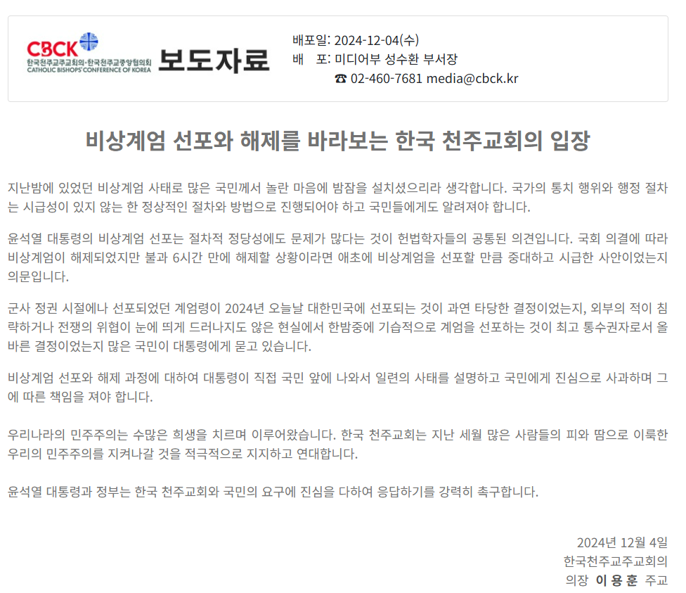 비상계엄 선포와 해제를 바라보는 한국 천주교회의 입장