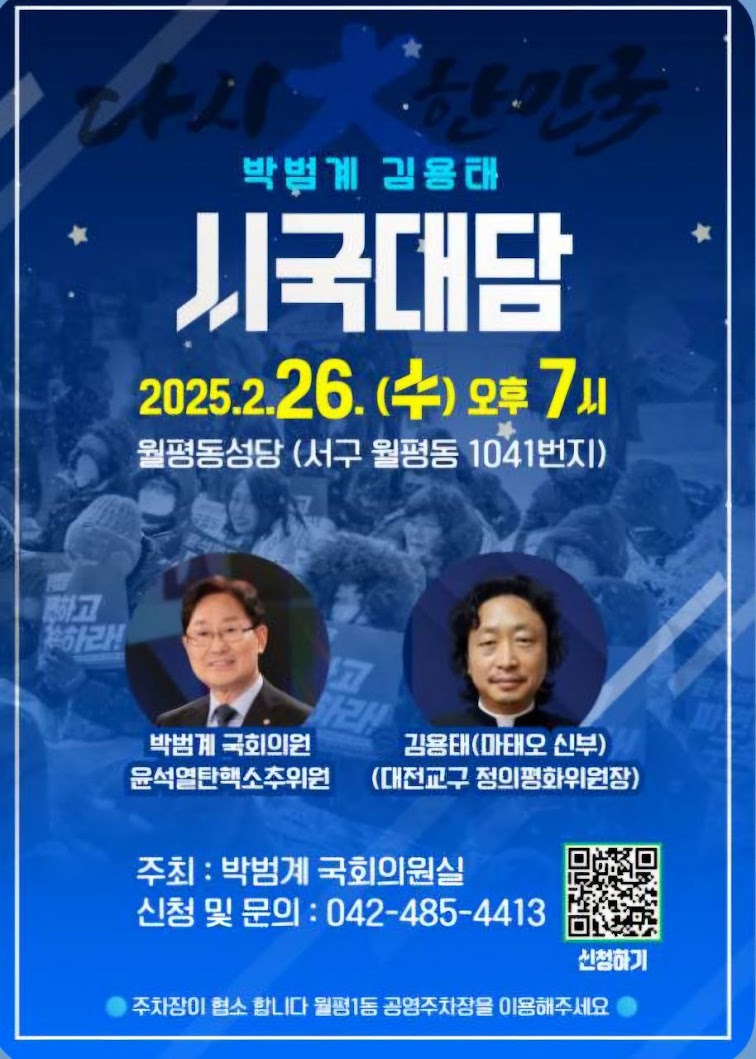 천주교 대전교구 정의평화위원회 위원장 김용태 마태오 신부는 2025년 2월 26일(수) 저녁 7시, 대전 월평동 성당에서 박범계 의원과 함께 시국 대담을 가졌다, 이 자리에서 김용태 신부는 "신부의 역할과 정치 참여에 대해 일부 보수 세력으로부터 "정치적 발언을 하지 말라"는 비판을 받고 있지만, 정치는 공동선을 실현하는 가장 큰 형태의 사랑"이라고 강조했다. 자세한 내용은 아래 참조