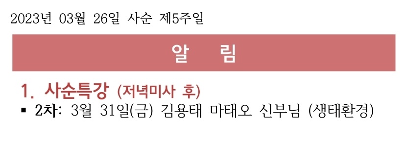 대전 둔산동 성당, 2023.3.31.(금) 오후 7:30, 미사 후 특강