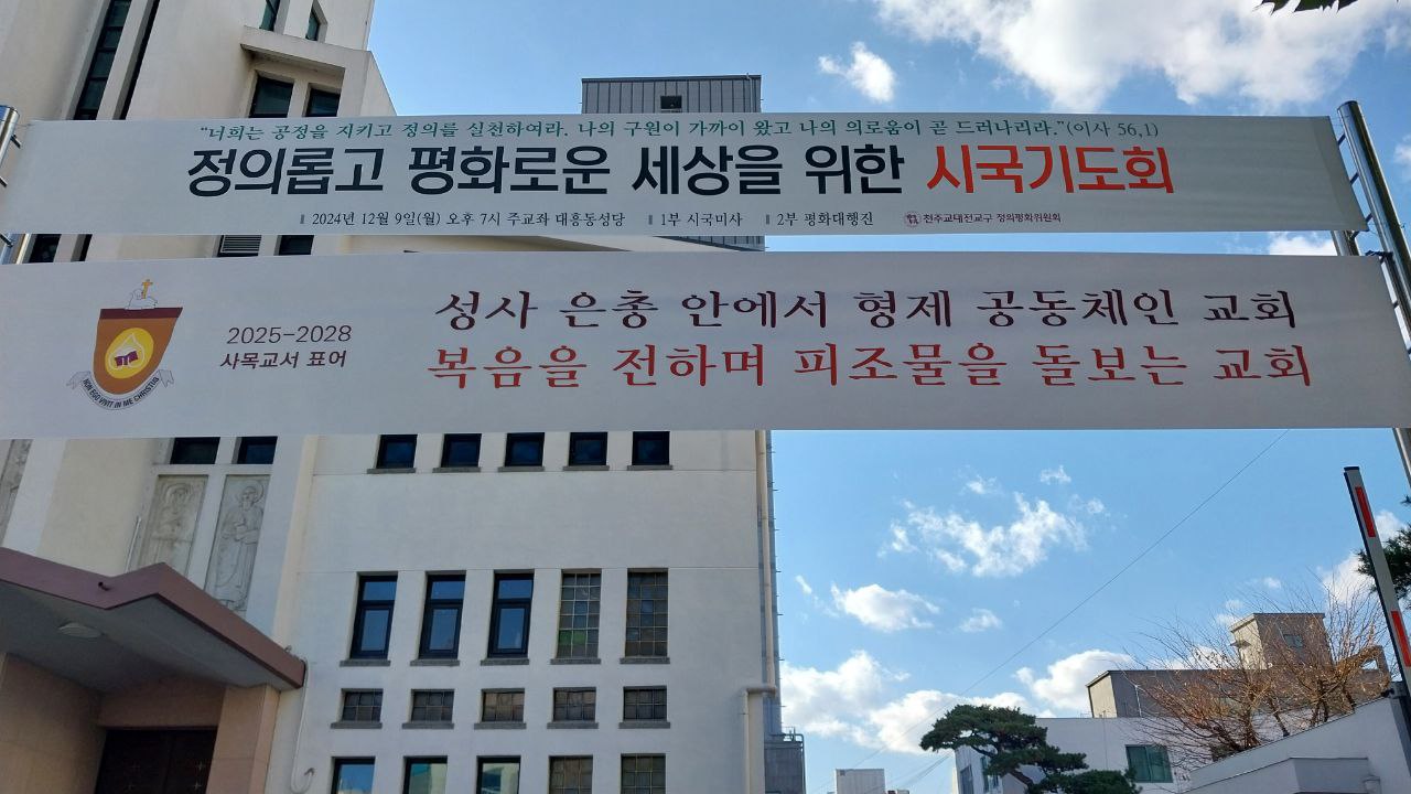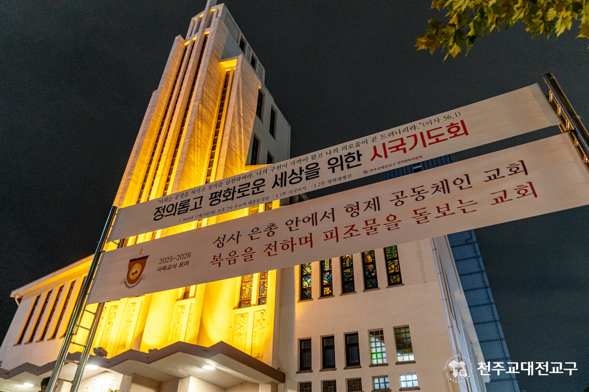지난 3일 윤석열 대통령의 계엄령 선포에 이은 내란 사태가 종식되지 않은 가운데, 천주교대전교구 정의평화위원회가 9일 저녁 7시 주교좌 대흥동 성당에서 시국기도회를 개최했다. 대흥동 성당