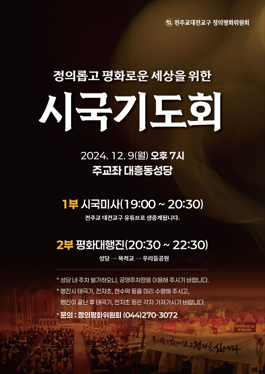 천주교 대전교구 정의평화위원회(위원장 김용태 신부)는 12월 9일(월) 주교좌 대흥동성당에서 '정의롭고 평화로운 세상을 위한 시국기도회'를 거행했다. 1부(시국미사), 2부(정의평화대행진)로 진행된 이날 기도회는 사제단 120명(대전교구 및 타교구,수도회), 수도자 및 신자 등 1,500여 명이 참여했다. 미사 후 주교좌 대흥동성당을 출발해 목척교를 거쳐 다시 우리들공원까지 행진을 한 후 연대단체발언과 구호 등을 제창한 후 행사를 마쳤다.